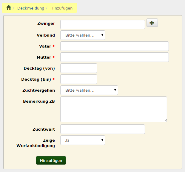 Zum anlegen einer Deckmeldung werden lediglich die Angaben des Zwingers, der Elterntiere, des Verbandes und des Decktages (Decktag bis) benötigt. Der Verband ist in der Regel bereits auf den entsprechenden Zuchtverband vorausgewählt.