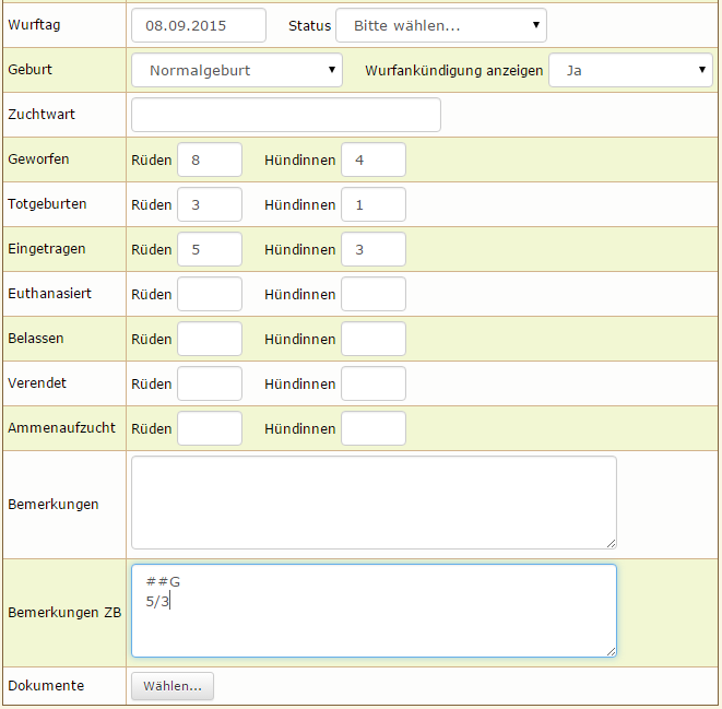 Nachdem nun die Welpen gefallen sind, kann die Wurfzahl getrennt nach Geschlecht sowie die Zahl der Totgeburten und die Geburtsart (Normalgeburt, Kaiserschnitt, Normalgeburt mit anschließendem Kaiserschnitt) eingetragen werden.