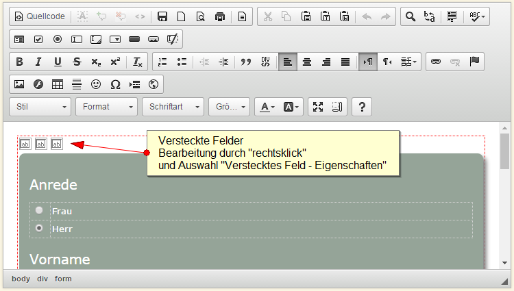 - Fügen Sie in das Formular an einer beliebigen Stelle ein verstecktes Feld mit dem Namen „formular“ ein. Als Wert (Value) geben Sie den Namen des Formulars an, unter dem es später angesprochen werden soll