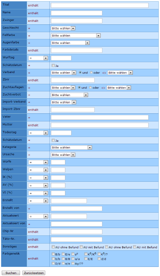 Über die erweiterte Suche kann nach fast beliebigen Kombinationen von Suchbegriffen im Datenbestand gesucht werde. So ist es z. B. möglich alle Rüden zu suchen die zwischen dem 01.01.2000 und dem 31.12.2003 geboren wurden, im VDH gezüchtet wurden und deren Inzucht unter 3% liegt sowie einem AVK der mind. 90% beträgt.