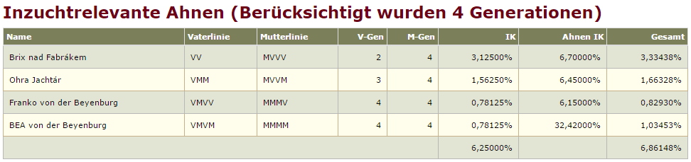 Ebenso ist es möglich die Ahneninzucht in die Berechnung einzubeziehen, bzw. diese außer acht zu lassen. Nachfolgend ein Beispiel für eine detaillierte Inzuchtberechnung: