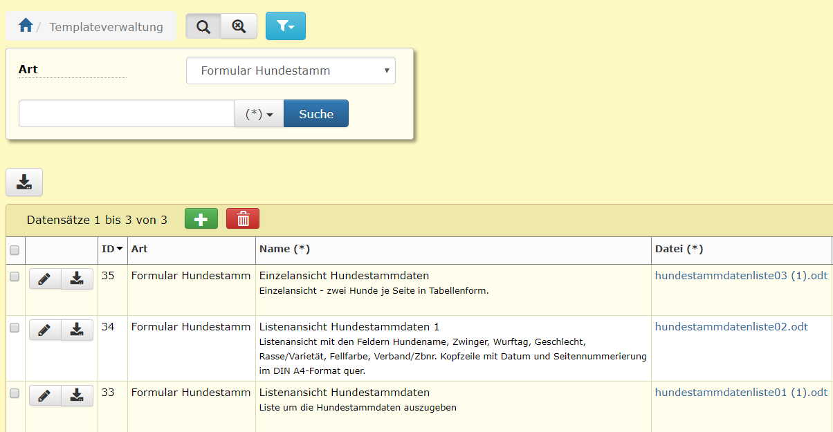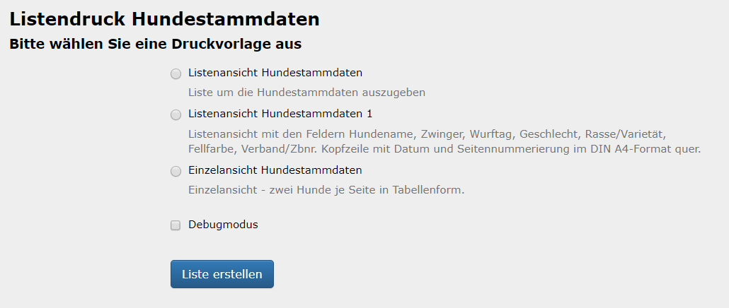Die Module Hundestammdaten, Adressstammdaten, Zuchtstättenverwaltung und Deck-/Wurfmeldungen ermöglichen einen umfangreichen Druck von Listen und Formularen. Das Layout dieser Ausgaben kann über Office-Templates beliebig gestaltet werden.