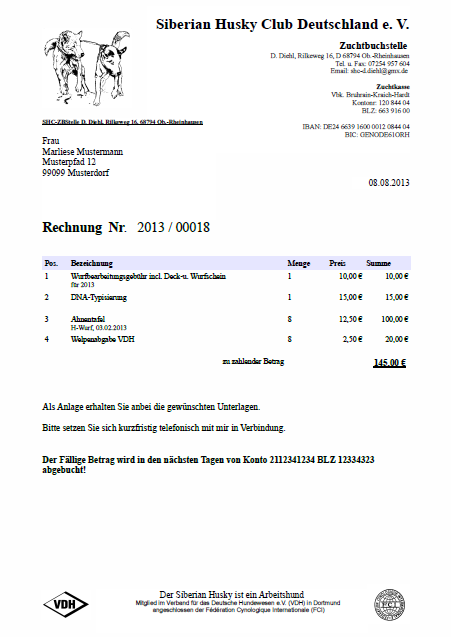 Breedmaster bietet einen komfortablen Rechnungsdruck für das Zuchtbuchwesen. Über das integrierte Templatesystem kann das Erscheinungsbild einer Rechnung komfortabel mit LibreOffice bzw. OpenOffice oder Word bearbeitet und angepasst werden.