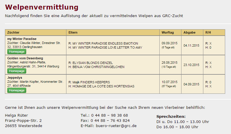 Über die Welpenvermittlung können sowohl Welpen als auch Junghunde und adulte Hunde verwaltet werden. Es ist möglich für die unterschiedlichen Altersgruppen verschiedene Layouts zu verwenden um ein individuelleres Erscheinungsbild zu erhalten.