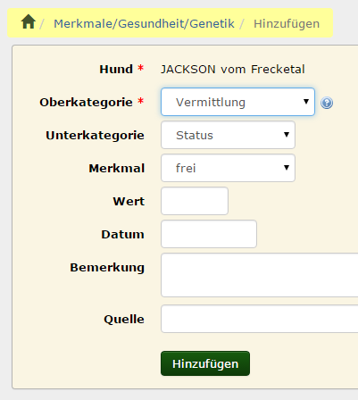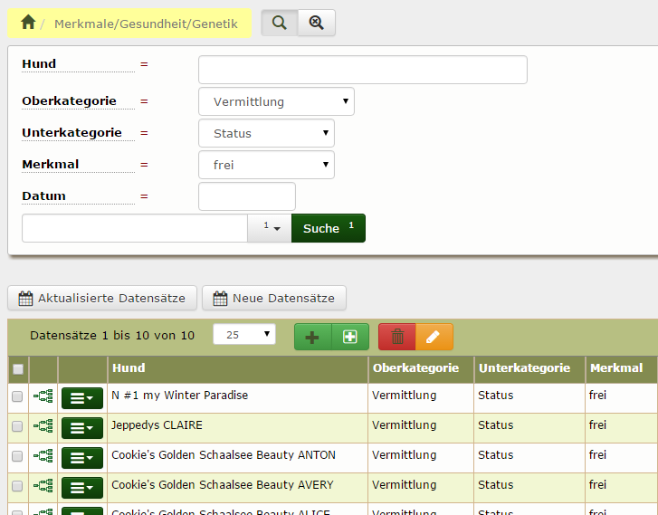Alternativ kann selbstverständlich auch über Datenverwaltung → Merkmale/Gesundheit/Genetik und Hinzufügen (Einzel- oder Gridmodus) ein Eintrag vorgenommen werden. Wenn mehrere Einträge vorgenommen werden sollen, ist dies der schnellere Weg, sofern man die Namen der einzutragenden Hunde kennt.