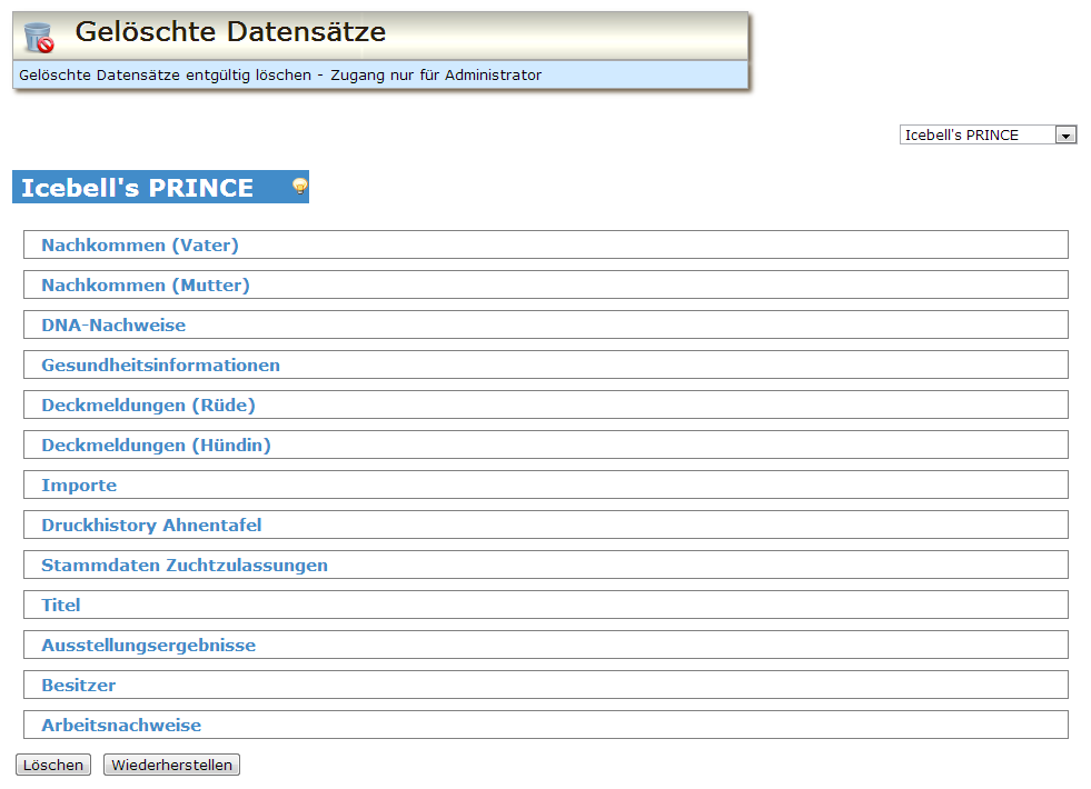 Im Papierkorb werden die gelöschten Hunde-Stammdatensätze bis zur endgültigen Löschung oder Wiederherstellung zwischengespeichert. Da diese nicht mehr im regulären Datenbestand vorhanden sind, ist es nicht möglich diese Datensätze im Pedigree oder in sonstigen Ansichten zu betrachten. Hierfür dient ausschließlich die „Info-Ansicht“ des Papierkorbes.