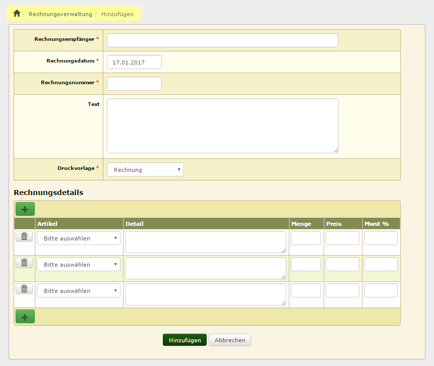 Eine Rechnung wird über den Menüpunkt SONSTIGES → Fakturierung → Rechnungen Stammdaten erstellt. Durch klick auf die Schaltfläche [HINZUFÜGEN RECHUNGSVERWALTUNG/RECHNUNGSDETAILS] öffnet sich die Eingabemaske für eine Rechnung. Stammdaten RechnungZunächst müssen die Stammdaten der Rechnung erfasst werden, hierzu zählen der Empfänger der Rechnung, Rechnungsdatum, Rechnungsnummer und welche Rechnungsvorlage Verwendung finden soll.